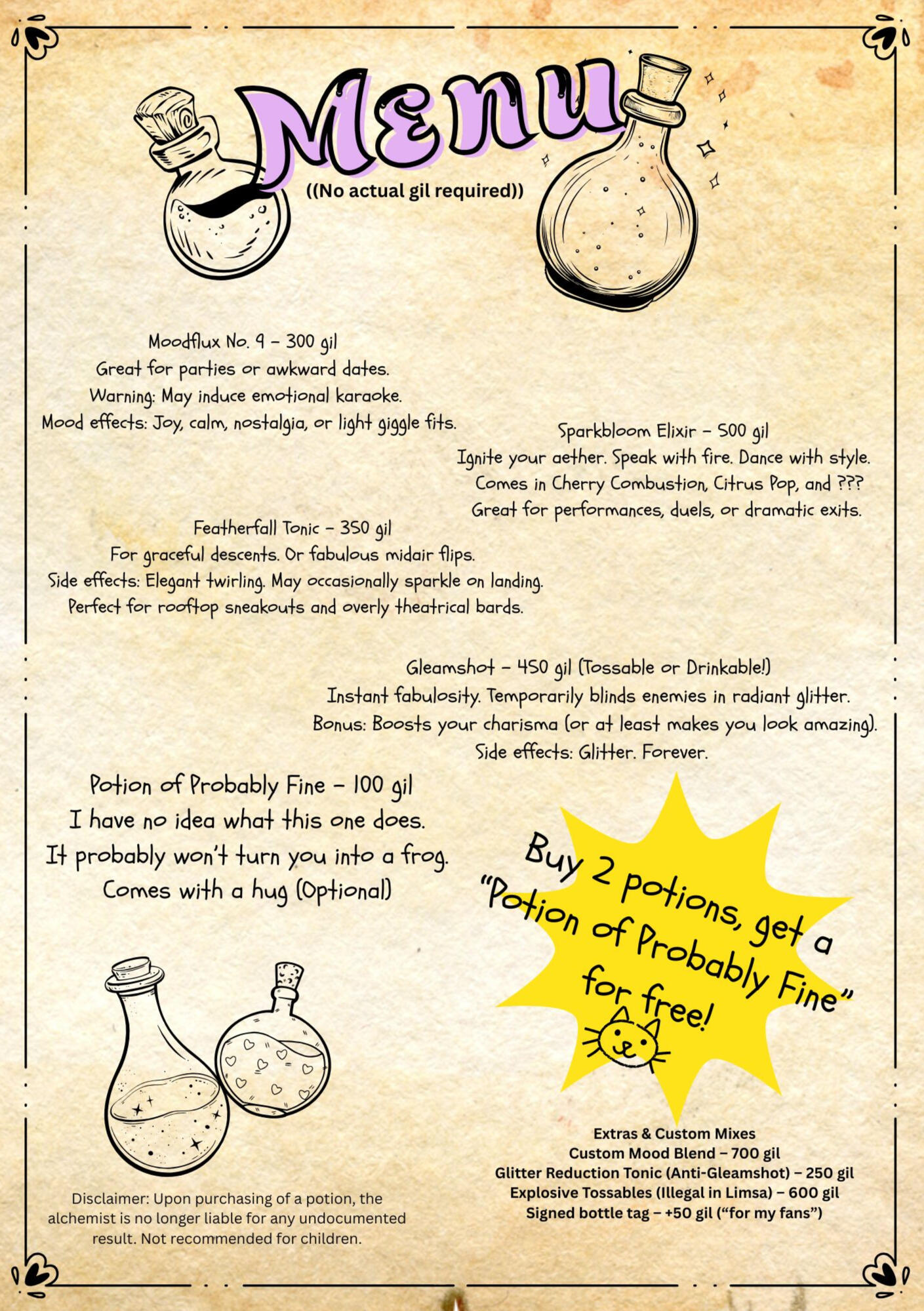 "Okay, so. It wasn't the best beginning. Sure, I would have liked to live with my parents like I was meant to but I was lucky to get adopted by someone who knew them. Professor Seth Hearthclaw was an old family friend and was willing to take me in after what happened. He's very good at encouraging my interests, even if they're frowned upon by the rest of my teachers. Suuuure, I explode some things sometimes but I'm getting better at alchemy every day. He says I have a lot of potential. Yeah. I want to make him proud.I only wish people here were more willing to have fun. We can all make your run of the mill potion, but where's the fun in that? I'm working on a lil something that might shake things up but I think it could be really good! Or well. At least harmless and fun? I just need to be a teeeensy bit careful but it'll probably be fine.So, uh, in the end I got expelled. Yeah, yeah, yeah look, I know you probably want all the dirty deets but how about you buy a potion instead?, They're not technically legit...and not entirely legal...but my bestie says something being legitimate doesn't account for much since anyone can say anything and you wouldn't know if it's true or not. Something something...establishment bad. ANYROAD!...want to buy a potion? They're fun and unique and you won't find anything like them anywhere else on the Realm. Probably. Maybe. So c'moooooon! Please?"